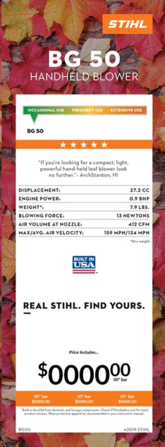 - Get superior performance from the BG 50 gasoline-powered handheld blower. Built here in America*, this reasonably priced tool boasts the highest power-to-weight ratio in the STIHL gas-powered line, making it the perfect choice for homeowners seeking premium STIHL quality. Its lightweight, compact design features a fuel-efficient engine, toolless air filter access and an upright fuel tank for easier filling. Clean up yard waste and leaf piles quickly and easily with this affordable and convenient blower.