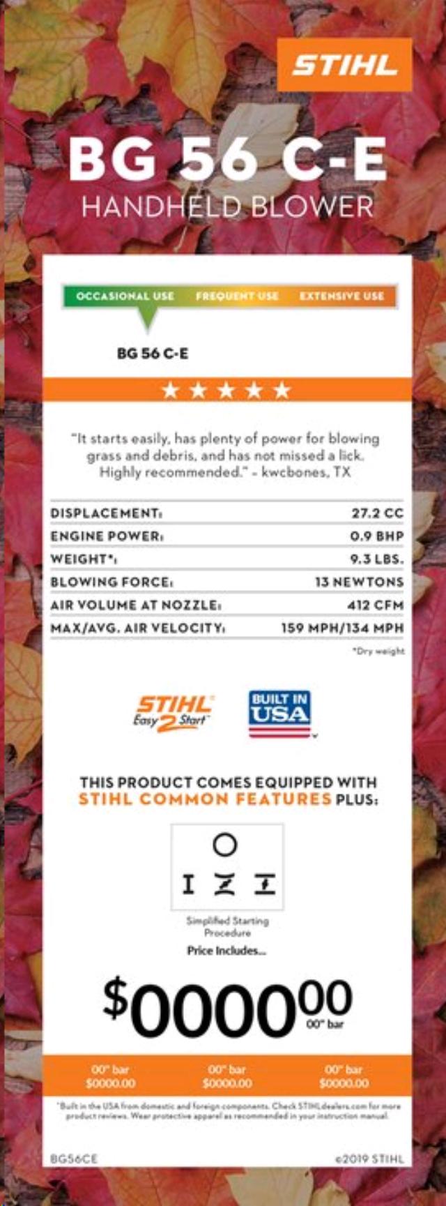- Designed with ease of use in mind, the STIHL BG 56 C-E features our simplified starting system with the STIHL Easy2Start . The STIHL Easy2Start lets you start the engine with a long easy pull of the starting rope rather than a hard fast jerk, making starting virtually effortless. The semi-automatic choke and the new start/stop switch make it virtually impossible to flood when starting this unit. The high-performance, low-emission engine makes quick work of leaves and other yard waste.