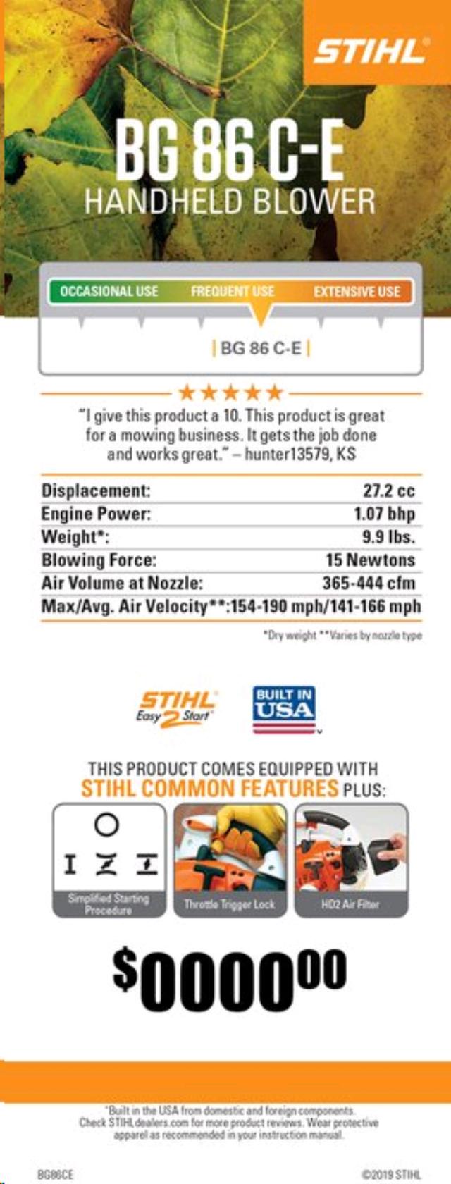 - Ultimate power meets ultimate simplicity. The STIHL BG 86 C-E is the best of both worlds, offering the same no-compromise power and comfort found in the BG 86, but with our Easy2Start technology. Now, starting the engine is fast and easy for just about anyone just a long slow pull of the start cord instead of a hard jerk. To make it even easier, this blower has the simplified starting system that incorporates a specialized stop switch that automatically returns to the start position, as well as a semi-automatic choke lever that helps prevent accidental flooding. And just like the BG 86, this blower comes with both flat and round nozzles for better versatility on the job.