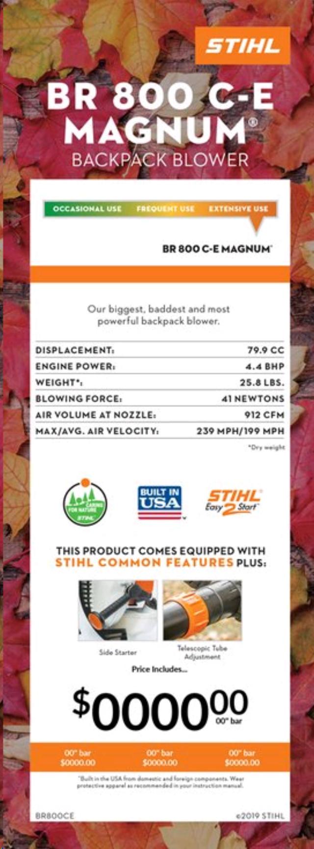 - To tackle large properties and heavy debris, there is nothing like the clean-up power of the BR 800 C-E MAGNUM . Built in America*, the most powerful backpack blower in the STIHL line offers maximum blowing force as well as optimal comfort. Ideal for professional landscapers, it features a multi-function control handle allowing users to effortlessly access all the controls on one comfortable handle. This blower completes tasks with 20% more power than the BR 700, and can be hung for storage. Its telescopic tube is easily adjustable for various user heights without the use of tools. The BR 800 C-E MAGNUM also features a starting handle on the side of the unit, allowing users to start and restart the engine while continuing to wear the blower on their back, and a one-touch stop switch that can turn off the engine with the simple press of a button.