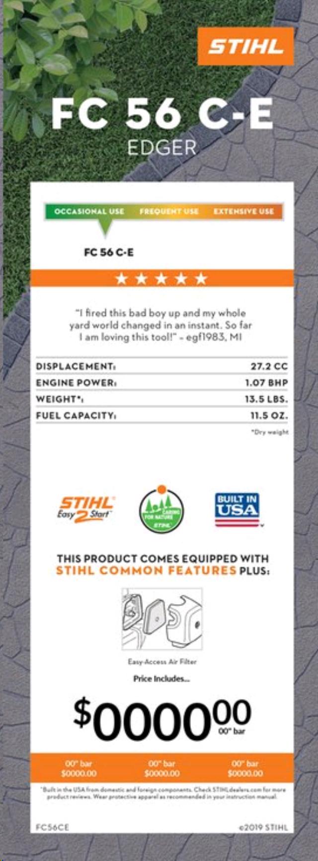 - Give your home that professionally landscaped look with the STIHL FC 56 C-E edger. With its fuel-efficient, low-emission STIHL engine, this edger powers through curbside annoyances like overgrown grass, thick weeds and compacted soil. And thanks to its semi-automatic choke lever and Easy2Start system, starting the edger is easy gently pull the cord and start defining your outdoor spaces. Its adjustable depth wheel even lets you select different cutting depths, so you can give your walkways, driveways and areas of your property the perfect amount of definition.