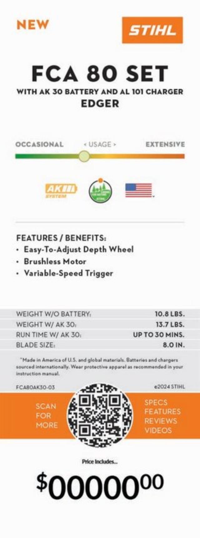 - As the first battery-powered edger in the STIHL AK Homeowner System, the FCA 80 brings the same exceptional power and performance as its gas-powered counterpart, the FC 56 C-E. With a curved shaft, loop-handle design and an adjustable depth wheel, this edger helps achieve a precise cut with ease and comfort. Equipped with a brushless motor, the FCA 80 is virtually maintenance free. With two speed levels, you can optimize performance based on your needs reduce speed for extended run times or raise it for maximum power. Homeowners will enjoy adding this powerful precision tool to their yard care lineup.