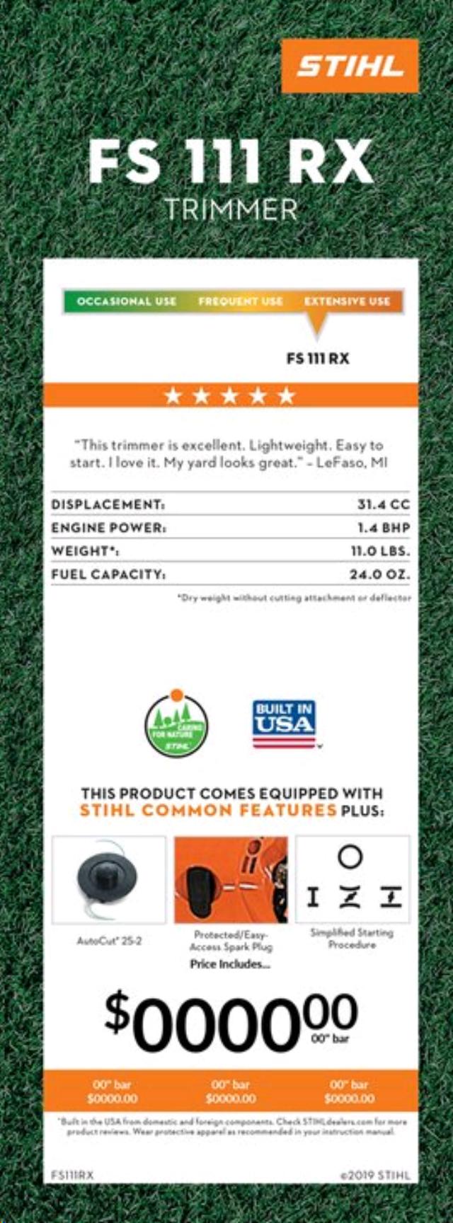 - Trim circles around other professional trimmers with the STIHL FS 111 RX trimmer. It provides 30% longer run times than the FS 100 RX to help get to the job quicker. It also saves users time with a simplified three-step start procedure. Through its semi-automatic choke lever and one-touch stop, the FS 111 RX allows users to turn off the engine with the simple press of a button. Thanks to its high-powered and low exhaust emission engine, this straight, hollow steel shaft trimmer is dependable and practical. Additionally, its loop handle makes for excellent maneuverability around landscaping obstacles. The FS 111 RX is the perfect choice for professionals with demanding trimming needs.