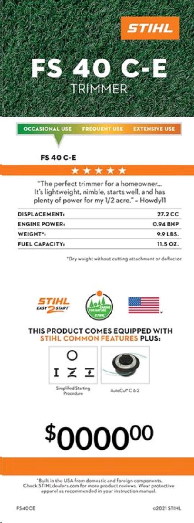 - This entry-level trimmer feels like first class. The STIHL FS 40 C-E trimmer is lightweight, balanced in hand and features a curved shaft for exceptional handling. And that s just the outside of the trimmer. Inside, the low exhaust emission and fuel-efficient engine is ideal for home use putting grass and weeds to rest with good cutting power. This grass trimmer also features our innovative Easy2Start technology, so you can get started with just a simple pull of the starter cord. Together it makes for one fantastic deal, unless you re a weed.