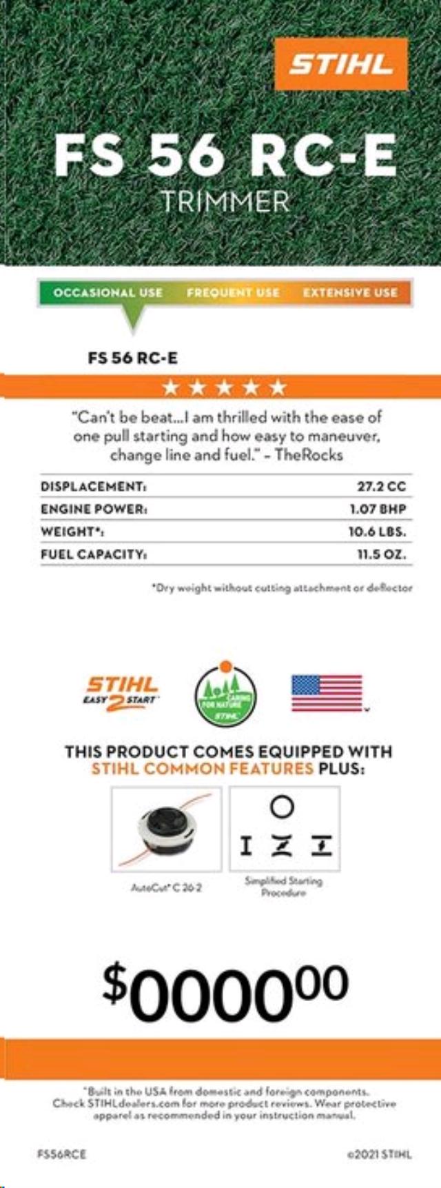 - More power, less emissions. The FS 56 RC-E trimmer features a high-performance, fuel-efficient engine that runs cleaner and smoother and provides about 5% more power than the FS 55 R. When it s not squeezing every last ounce of performance from its upright fuel tank, this straight-shaft grass trimmer keeps the weeds at bay, thanks to its AutoCut cutting head. This STIHL trimmer also features our Easy2Start technology, making starting nearly effortless. And with its simple, reliable and convenient starting procedure with a momentary stop switch which automatically returns to the start position, this trimmer is always at the ready to get to work. For comfort, performance and maneuverability, this trimmer hits the sweet spot.