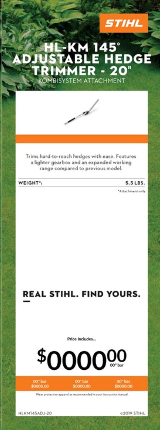 - With its redesigned gearbox and modern color scheme, the STIHL HL-KM 145 adjustable hedge trimmer attachment provides excellent, flexible cutting performance. Compatible with the STIHL KombiSystem, it features a 145 working range and is lighter than previous models. It will help reduce fatigue when trimming numerous and extensive hedges.