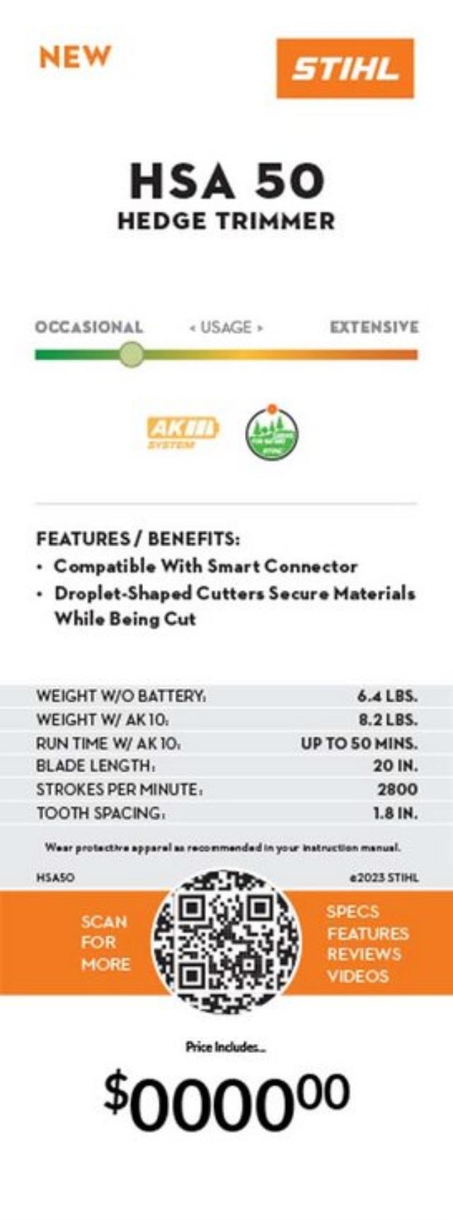 - The HSA 50 battery hedge trimmer features double-sided blades that cut both directions with droplet-shaped cutters that help secure materials in place while cutting. Combined with diamond-ground blades, this high-speed trimmer operates at 2,800 strokes per minute with minimal vibration and can cut up to 1,000 feet per charge. The HSA 50 hedge trimmer is compatible with the AK Battery System for homeowners and packs a powerful punch at an affordable price.