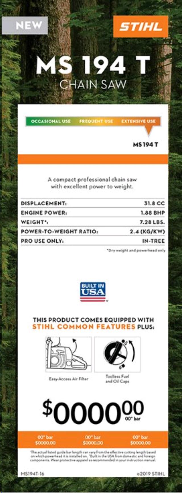 - With its exceptional power-to-weight ratio, the MS 194 T packs professional-grade performance into a compact and lightweight body. Its efficient, low-emission engine delivers excellent fuel economy, allowing users to save money on gas and save time on refueling. One-touch stop allows users to turn off the engine with the press of a button, which saves time and reduces the chance of flooding when restarting. Dependable and hardworking, the MS 194 T also includes a diagnostic port, making it easy to identify and service.