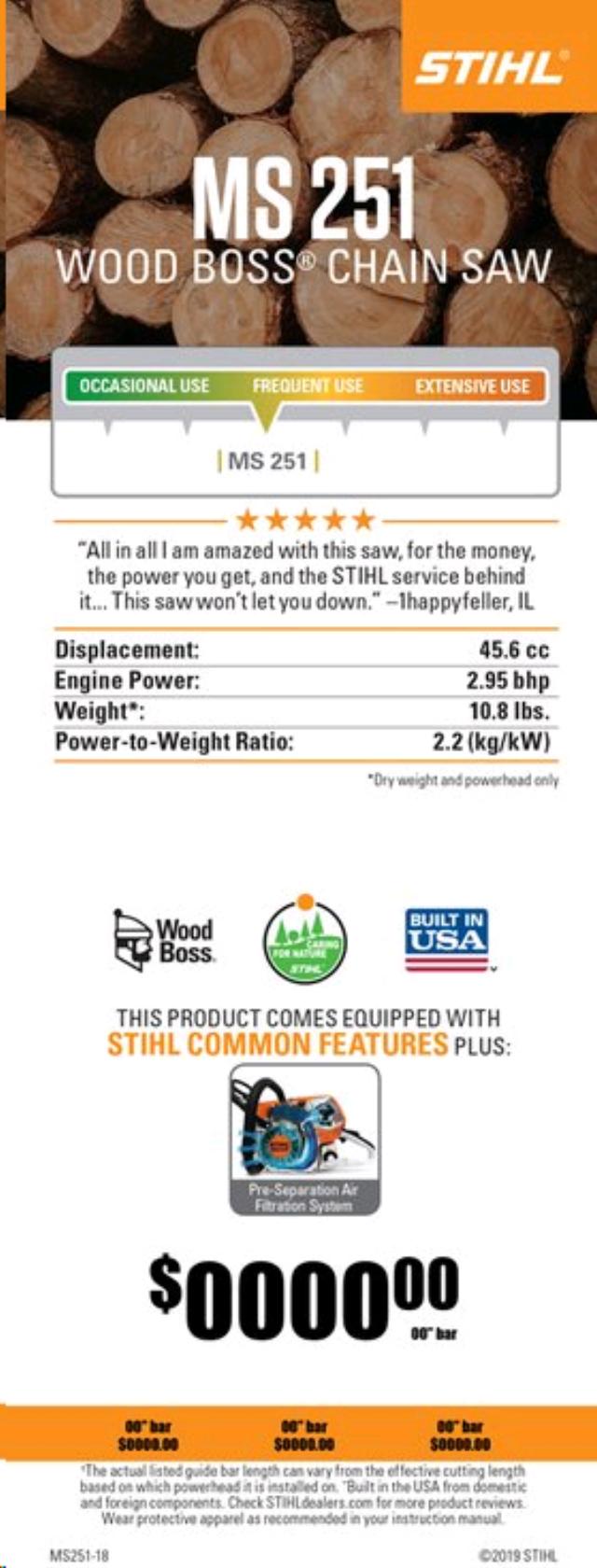 - The STIHL MS 251 WOOD BOSS Chainsaw is designed to deliver all the power you d expect from STIHL equipment, yet with a comfortable and ergonomic design. The MS 251 WOOD BOSS is perfect for felling small trees, pruning and thinning, and cutting firewood simply and efficiently. And with up to 20 percent fuel savings and 50 percent reduced emissions (as compared to previous models), you can enjoy a longer run time while feeling good about your impact on the environment. Features like a Master Control Lever and reduced vibration make the STIHL MS 251 WOOD BOSS a lean, easy-to-use machine that still packs plenty of power.