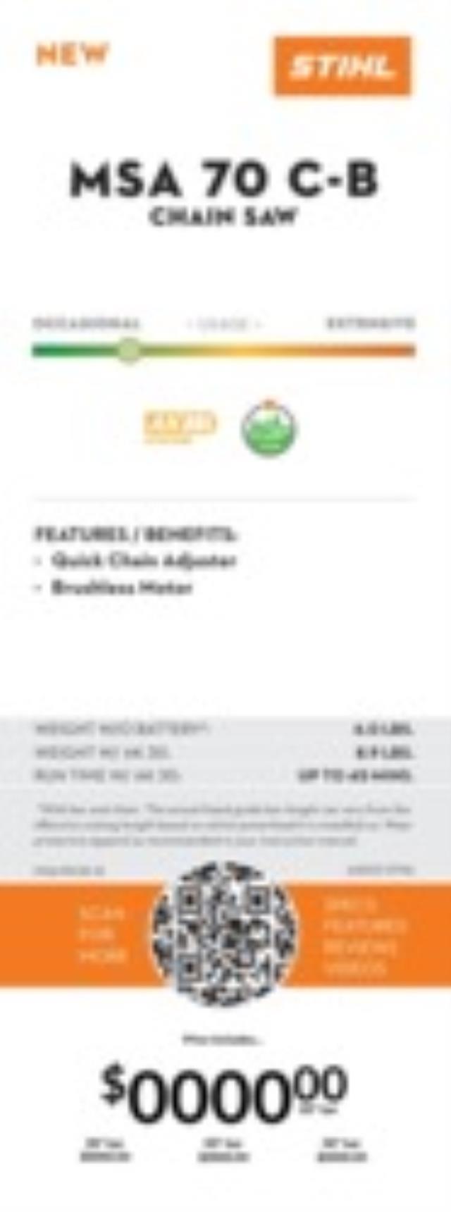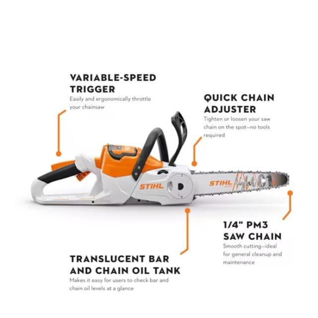 - With the AK 30 battery, this chainsaw delivers excellent cutting performance for up to 45 minutes on a single charge and is ideal for limb removal and storm cleanup. This chainsaw is a good option for suburban homeowners who perform yard work in noise-sensitive areas. It is compact and lightweight at 8.6 lbs. with the bar and chain and AK 30 battery, and 5.7 lbs. without battery, making this chainsaw easy to use and maneuver. The MSA 70 C-B also features the exclusive STIHL PICCO saw chain which assures clean, smooth cuts, and has a high-torque brushless motor delivering ideal speed and durability for a virtually maintenance-free service life.