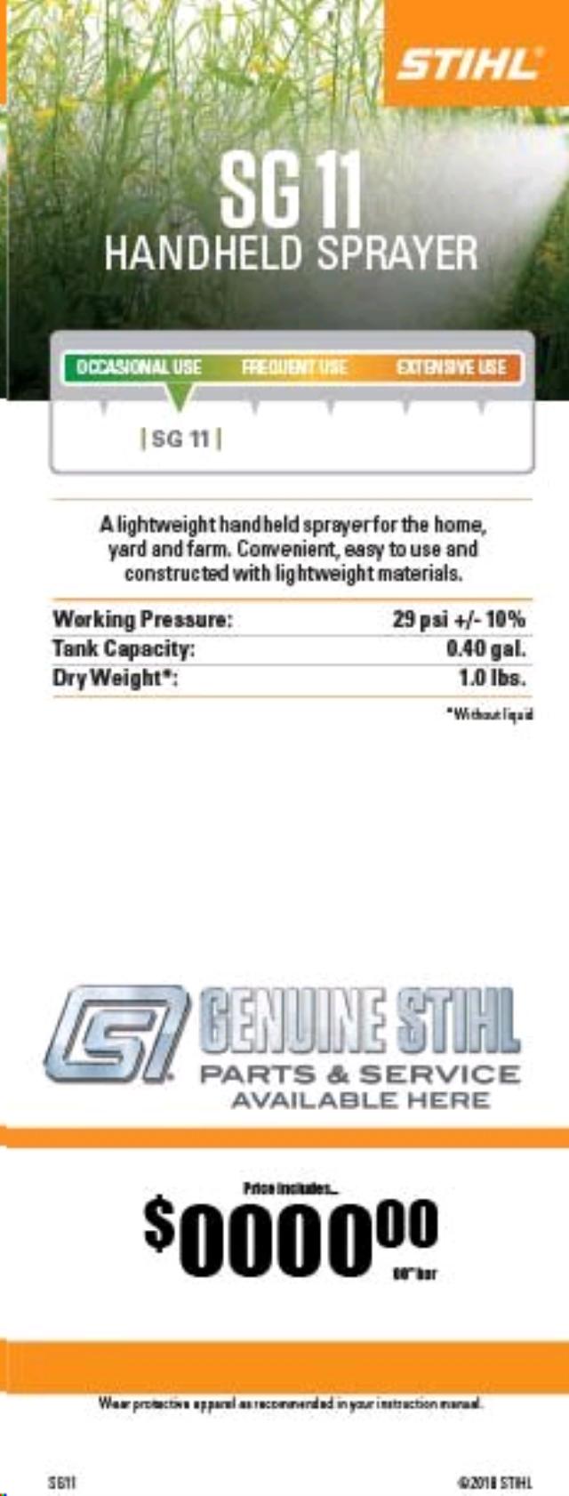 - Convenient, easy-to-use and constructed with lightweight materials, the versatile SG 11 manual, handheld multipurpose sprayer is great for the garden, yard or farm. Use it to mist or spray liquid fertilizers, pesticides and disease-controlling chemicals with precision. The SG 11 features a translucent tank for managing liquid levels as well as a non-adjustable hollow cone nozzle. No matter where you need it, this compact sprayer will help you get up close when protecting your plants.
