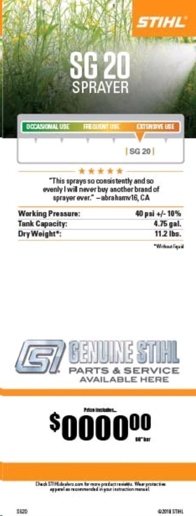 - When working with compounds such as pesticides and herbicides, accuracy and control are top priorities. The STIHL SG 20 manual backpack sprayer helps ensure constant working pressure, thanks to a pressurized fluid reservoir separate from the main tank. Now you can maintain constant pressure, even through refills. The sprayer is also comfortable and lightweight, helping you get through the day with less fatigue.