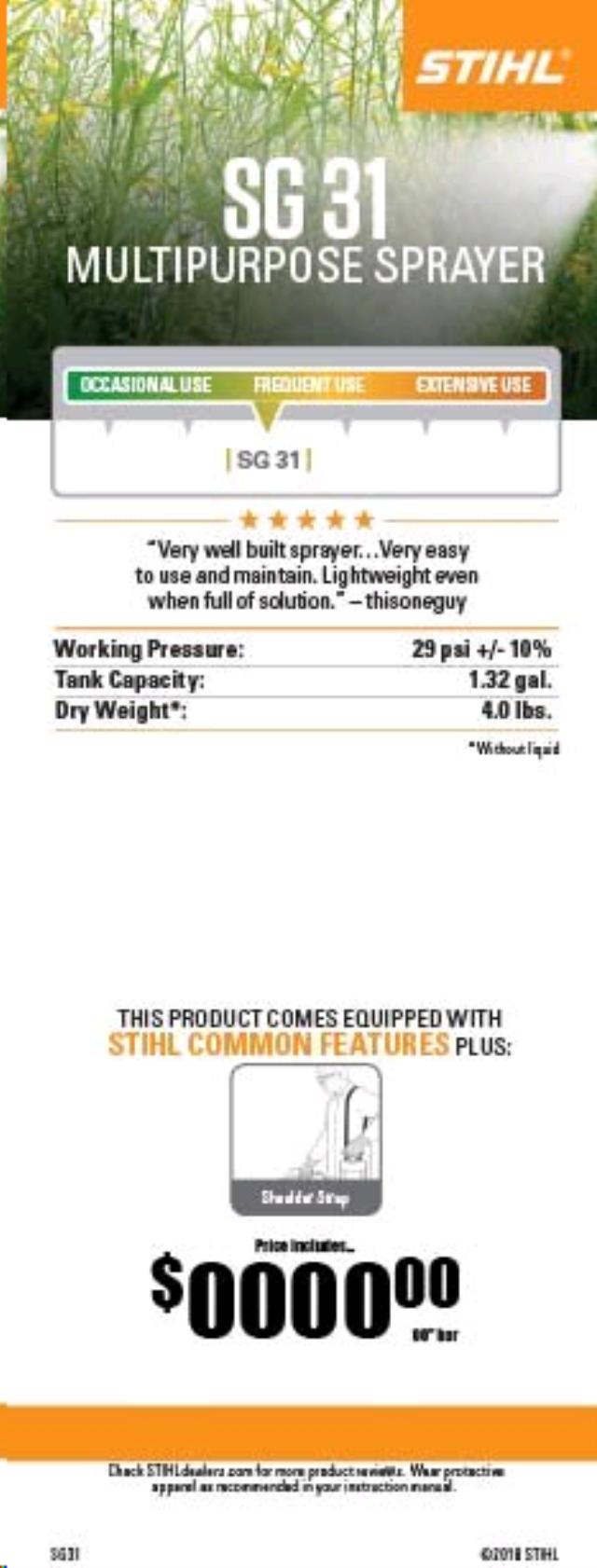 - The SG 31 sprayer is a powerful, easily portable piece of equipment. Equipped with a 5-liter tank, the sprayer falls between the SG 11 and the larger SG 51 in terms of volume capacity. This multipurpose sprayer can be used to apply fertilizers, pesticides, herbicides, and insecticides to your plants. It s built with lightweight materials, making it a convenient tool to carry with you both in the yard and on the farm. The easy-to-use design includes a pump handle that can be locked into place for use as a carrying handle, along with a translucent tank for optimal visibility of liquid levels. The sprayer wand comes standard with a non-adjustable hollow cone brass nozzle, and a wand holder for secure transport and storage.